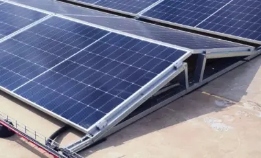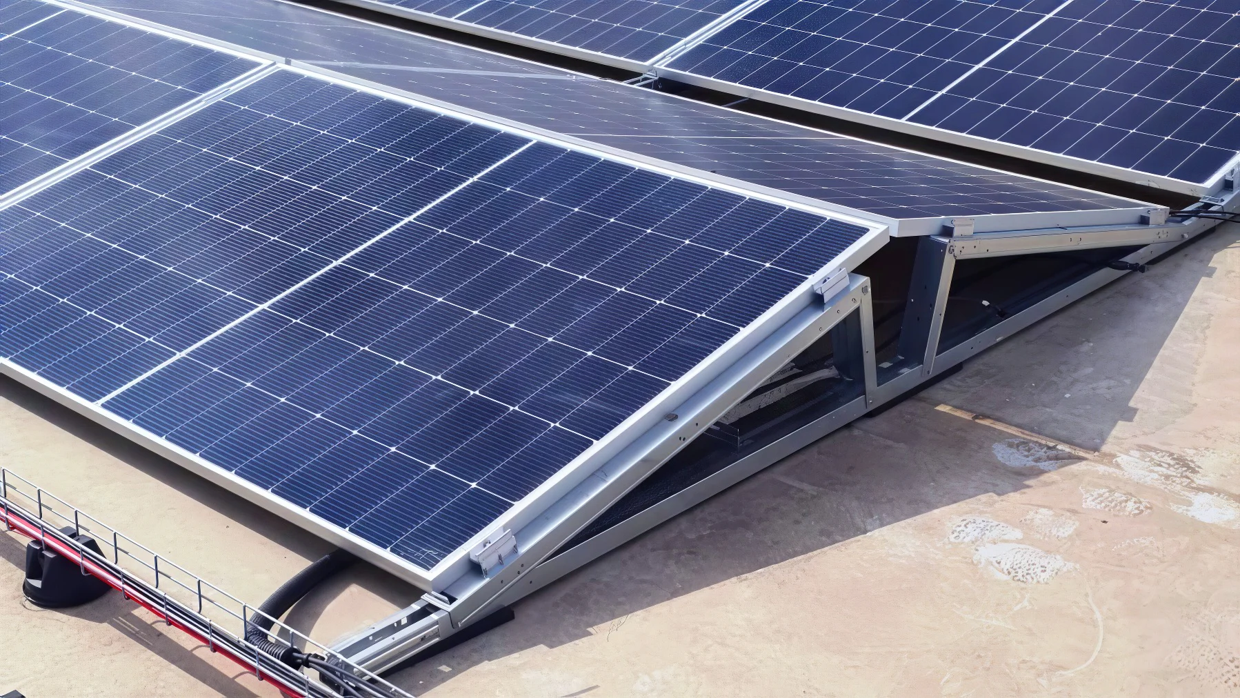 Installation avoids invasive roof penetrations by using a ballasted structure and carefully designed frames, ensuring the integrity of the building remains unaffected while the panels are mounted at a 10° tilt in an East–West orientation.